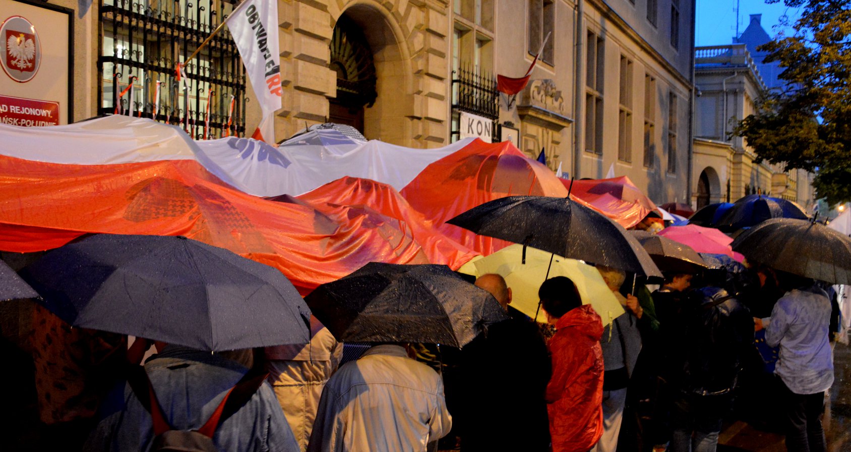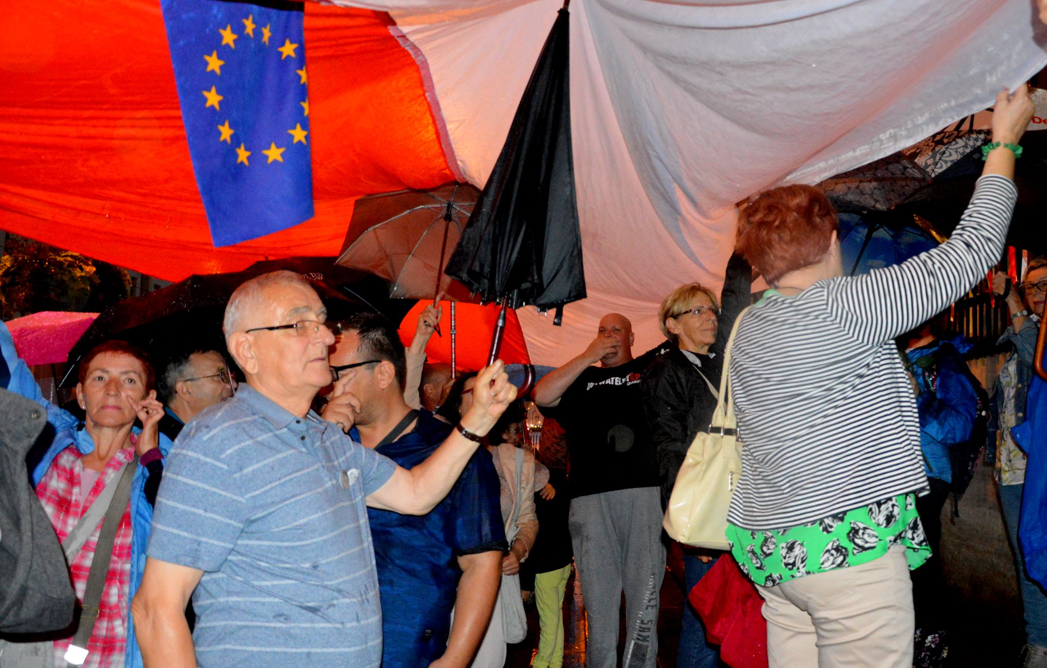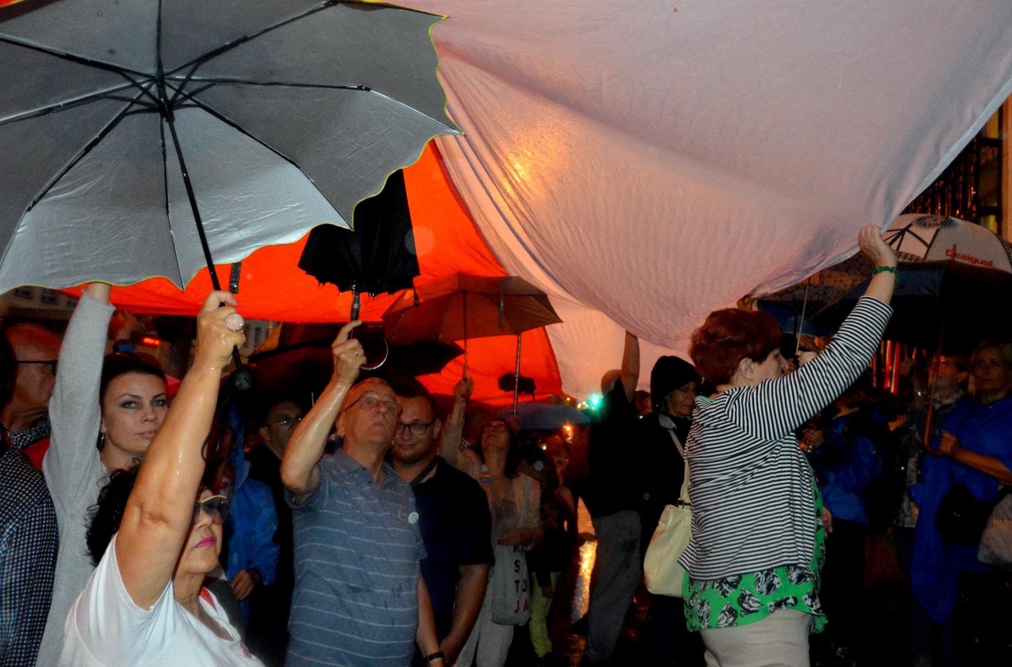 W poniedziałek 16 lipca pomorski KOD spotkał się pod Sądem Okręgowym w Gdańsku. Właśnie tego dnia mija rok odkąd Komitet Obrony Demokracji po raz pierwszy zorganizował demonstracje w obronie niezależnego sądownictwa. W Gdańsku manifestacja rozpoczęła się tradycyjnie wysłuchaniem preambuły Konstytucji RP oraz odśpiewaniem hymnu państwowego. Mimo niesprzyjającej pogody w zgromadzeniu udział wzięło wiele osób. Protestujący rozwinęli również biało-czerwoną sektorówkę. Zgromadzenie na wstępie swoim przemówieniem otworzył Michał Szulc, mówiący o Konstytucji, o tym że nie pozwolimy by władza zmieniła ją na swój użytek, wbrew narodowi. Podkreślał głównie ważność tych artykułów, które dotyczą sądownictwa oraz sędziów. Głos zabrał jeden z Gdańskich sędziów. Przypomniał zgromadzonym o tym, że obecna Konstytucja została przyjęta w ogólnonarodowym referendum. Opowiedział manifestantom o konsekwencjach jakie spotykają sędziów, którzy mają odwagę mówić prawdę i sprzeciwiać się niszczeniu niezależności sądów, między innymi o jednej z warszawskich sędzi. Pod sądem przemawiała również Dorota Zabłudowska – również sędzia miejscowego sądu. Powiedziała, że sędziowie sprzeciwiający się pisowskim reformom sądownictwa nie żałują tego i są świadomi konsekwencji swoich działań. Jak podkreślała sędzia, oprócz tego że są sędziami, są również obywatelami. Tłum skandował hasła wolne sądy. Nie tylko sędziowie ale również adwokaci zabierali głos pod sądem, między innymi mecenas Kanarka.