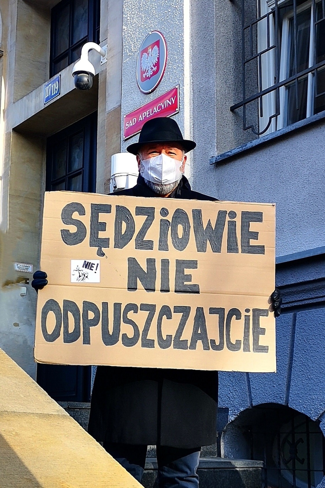 A my – członkowie i sympatycy śląskiego oraz małopolskiego KOD za każdym razem towarzyszymy mu przed budynkiem sądu aby nie był sam.