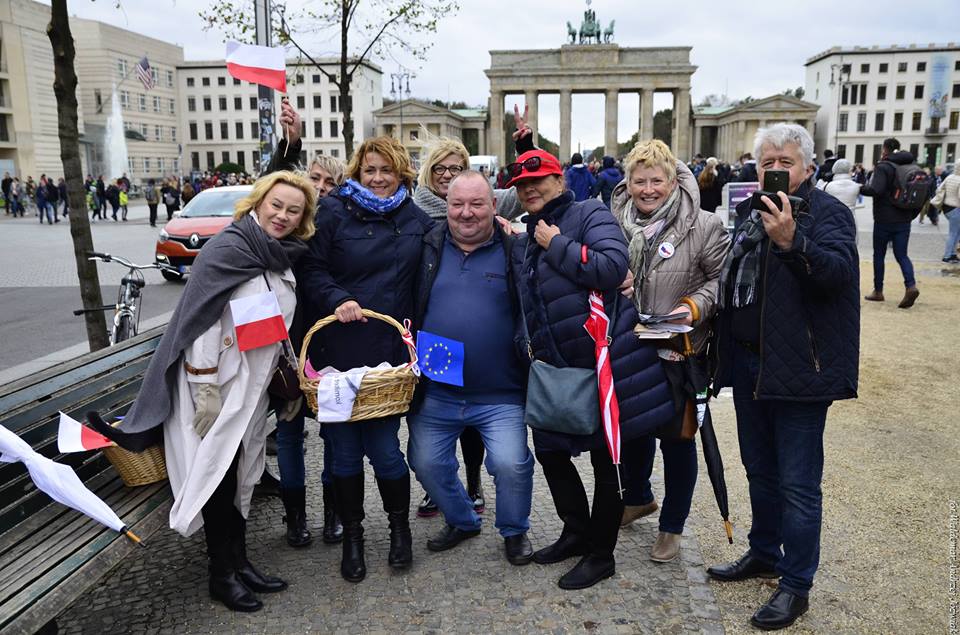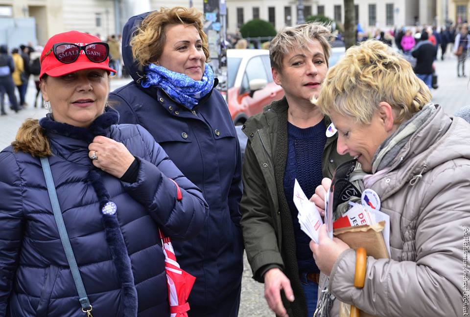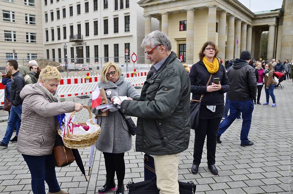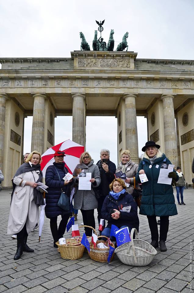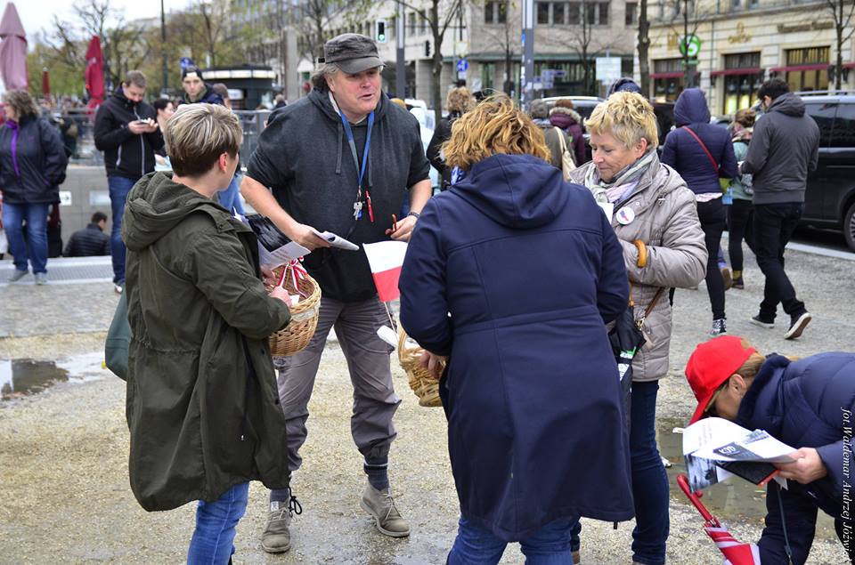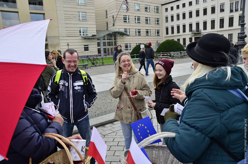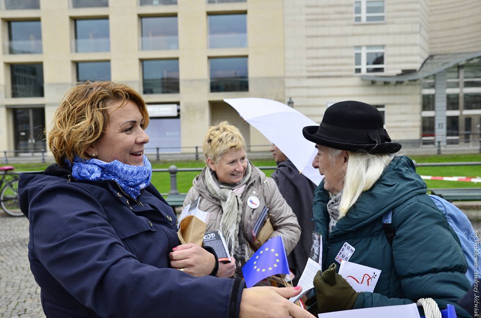 Przyjęto nas serdecznie i z uśmiechem, pan policjant sprawdził, czy mamy zgłoszone wydarzenie, następnie życzył nam udanej akcji. Chętnie czytano ulotki w językach niemieckim i angielskim, informujące o zagrożeniach wolności, demokracji i sądownictwa w naszym kraju przez PIS! Ulotki zawierały między innymi protest przeciw reparacjom wobec Niemiec , nacjonalizmowi, ksenofobii i homofobii, faszyzmowi, językowi nienawiści. Informowały, że Polacy chcą pozostać w Europie. Ze smutkiem i wzruszeniem czytano list z postulatami św.p. Piotra S, który w ramach protestu podpalił się pod Pałacem Kultury i Nauki. Ludzie, z którymi się spotkaliśmy mówili nam, że słyszeli o tym tragicznym wydarzeniu, że u nich media to nagłaśniały. Prowadzili z nami sympatyczne rozmowy – wielu Niemców, ku naszemu zaskoczeniu – w większości młodych ludzi, było zatroskanych sytuacją w Polsce – znają problem, potwierdzają, że w Polsce źle się dzieje, pytali, jak mogą nam pomóc.