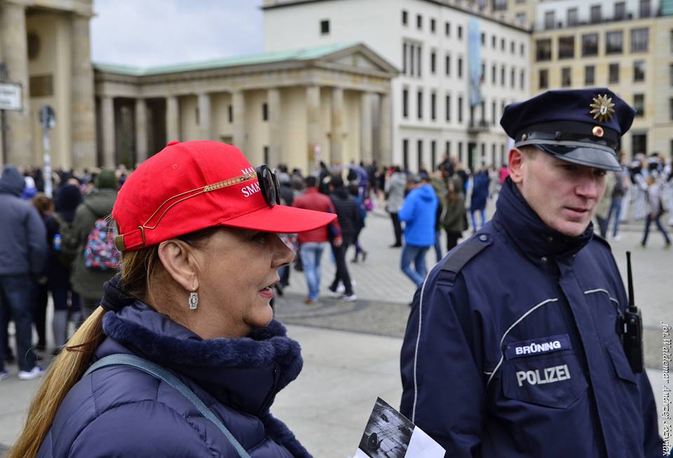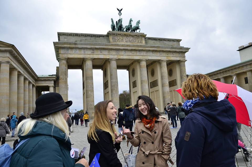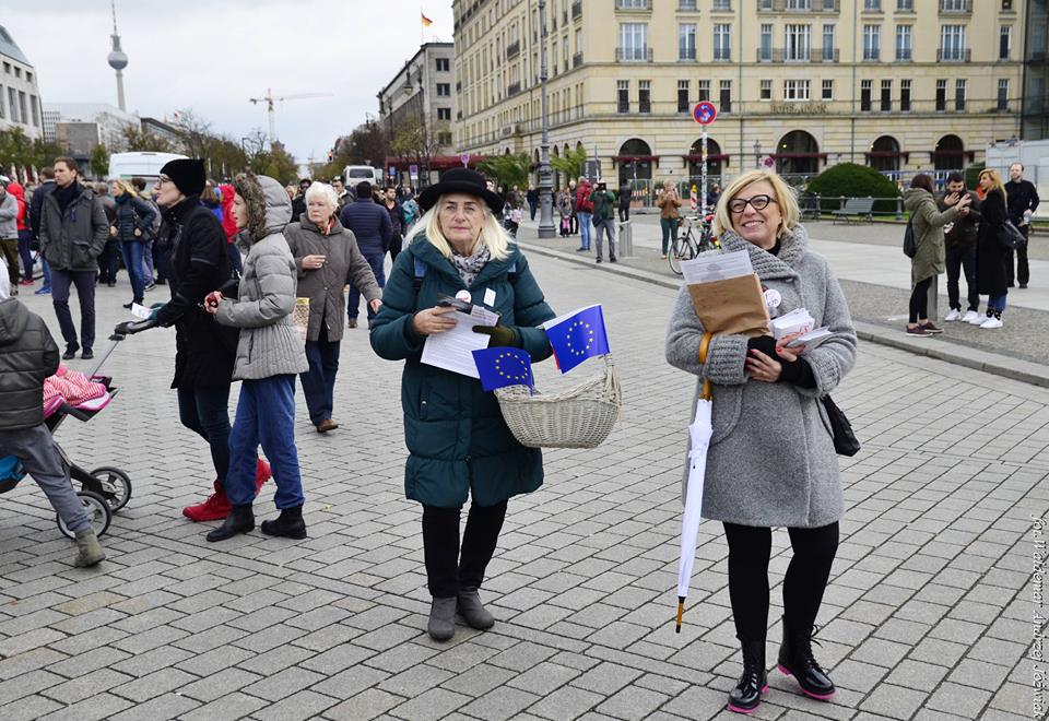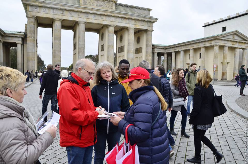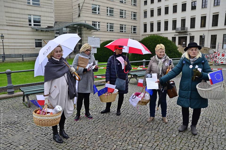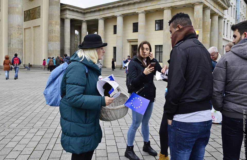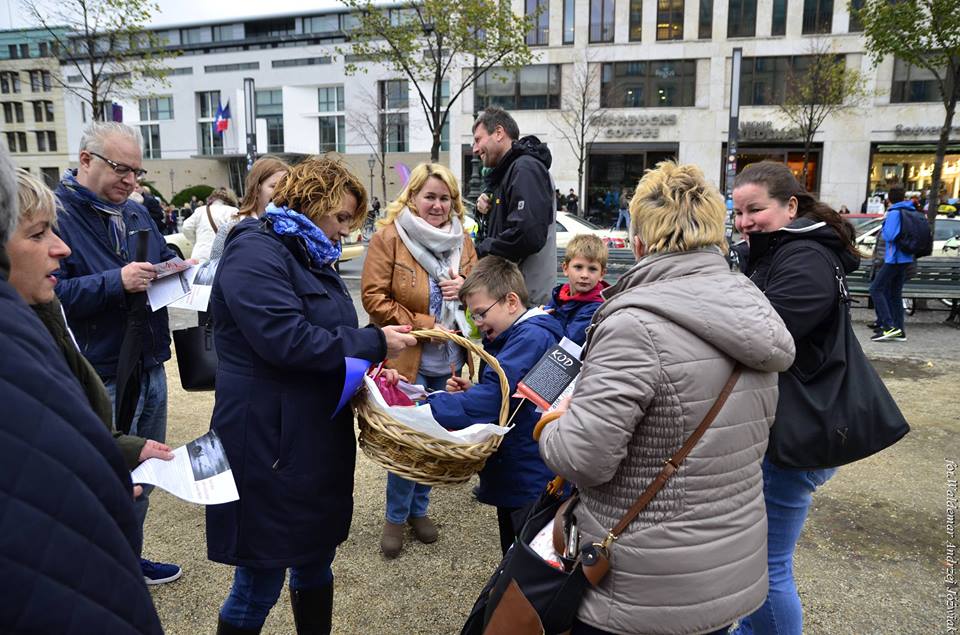 Przyjęto nas serdecznie i z uśmiechem, pan policjant sprawdził, czy mamy zgłoszone wydarzenie, następnie życzył nam udanej akcji. Chętnie czytano ulotki w językach niemieckim i angielskim, informujące o zagrożeniach wolności, demokracji i sądownictwa w naszym kraju przez PIS! Ulotki zawierały między innymi protest przeciw reparacjom wobec Niemiec , nacjonalizmowi, ksenofobii i homofobii, faszyzmowi, językowi nienawiści. Informowały, że Polacy chcą pozostać w Europie. Ze smutkiem i wzruszeniem czytano list z postulatami św.p. Piotra S, który w ramach protestu podpalił się pod Pałacem Kultury i Nauki. Ludzie, z którymi się spotkaliśmy mówili nam, że słyszeli o tym tragicznym wydarzeniu, że u nich media to nagłaśniały. Prowadzili z nami sympatyczne rozmowy – wielu Niemców, ku naszemu zaskoczeniu – w większości młodych ludzi, było zatroskanych sytuacją w Polsce – znają problem, potwierdzają, że w Polsce źle się dzieje, pytali, jak mogą nam pomóc.