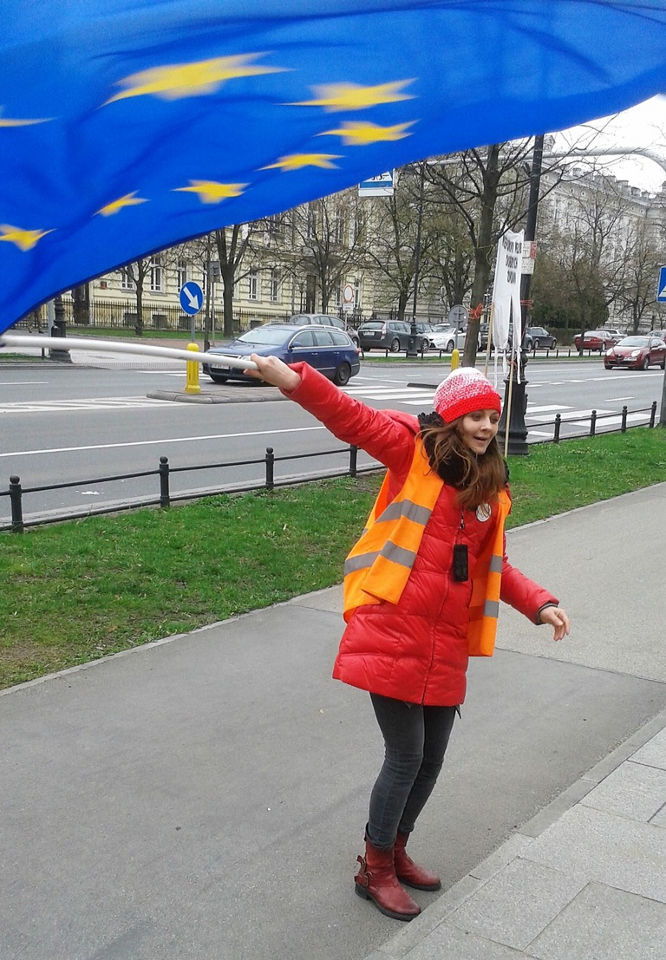 Dowiedziała się, chyba z telewizji, bo nie była jeszcze na Facebooku, że ktoś organizuje pikietę pod Trybunałem Konstytucyjnym. Od razu wiedziała, że musi tam być! Nie mogła doczekać się końca pracy. Zadzwoniła do rodziny. Usłyszała: – Córko nie możemy tam być, idziesz tam także za nas. Wreszcie pobiegła. Kilkadziesiąt osób, paru mężczyzn z tubami, słychać jakieś hasła. I ten gość w skórzanym kombinezonie. Dziwny, ale energetyczny. Wszyscy uśmiechnięci, ale tacy onieśmieleni. Ją też sporo kosztowało, zanim zaczęła podejmować okrzyki. Poczuła – to jest jej miejsce! Zapisała się do grupy facebookowej KOD, a potem zaczęła szukać, czy coś się organizuje na Pradze. Przyszła na pierwsze zebranie, o którym dowiedziała się na FB i od razu zobaczyła Samantę, nawet pamięta, gdzie wtedy siedziała. Pierwsze wrażenie było smutne – dlaczego tutaj jest tak mało młodych!