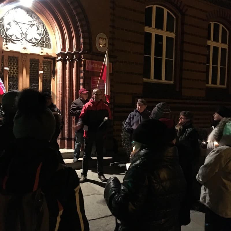 Grudniowe wieczory spędzaliśmy pod sądami ziemi opolskiej. Nie tak licznie, jak w lipcu, ale szczerze i w trosce o dobro wspólne wszystkich obywateli. To nie wystarczyło. Każde zło, któremu społeczeństwo nie da pokojowo odporu, nie zatrzyma się samo. Tak było i tym razem, gdy osoba sprawująca urząd Prezydenta RP po raz kolejny łamie Konstytucję RP do spółki z większością sejmową, senacką i rządową. W tych dniach w Polsce znika trójpodział władzy, a tym samym Polska zostaje postawiona poza nawiasem wspólnoty demokratycznych państw. Konstytucja staje się zbiorem pobożnych życzeń. Wszystkich zatroskanych o los kraju pozostawiamy ze słowami Stanisława Zabłockiego, sędziego Sądu Najwyższego: „Nawet jeśli nie będzie wolnych sądów i wolnych wyborów, to pamiętać o nich będą wolni ludzie”. My jesteśmy wolni, a ty?
