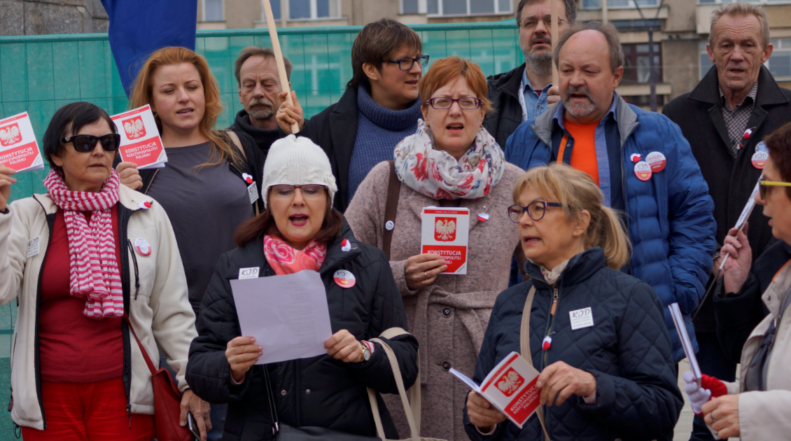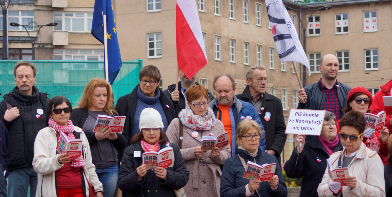 Tak oto spotkaliśmy się, przynieśliśmy biało-czerwone kwiaty. Grupa flashmobów pojawiła się licznie, żeby czytać Konstytucję, w tle z przenośnego głośnika odsłuchaliśmy treść preambuły Konstytucji Rzeczypospolitej Polskiej z 2 kwietnia 1997 roku. Wspólne śpiewanie hymnu zawsze wzrusza. Jeszcze kwiaty, biało-czerwone znaki pamięci.