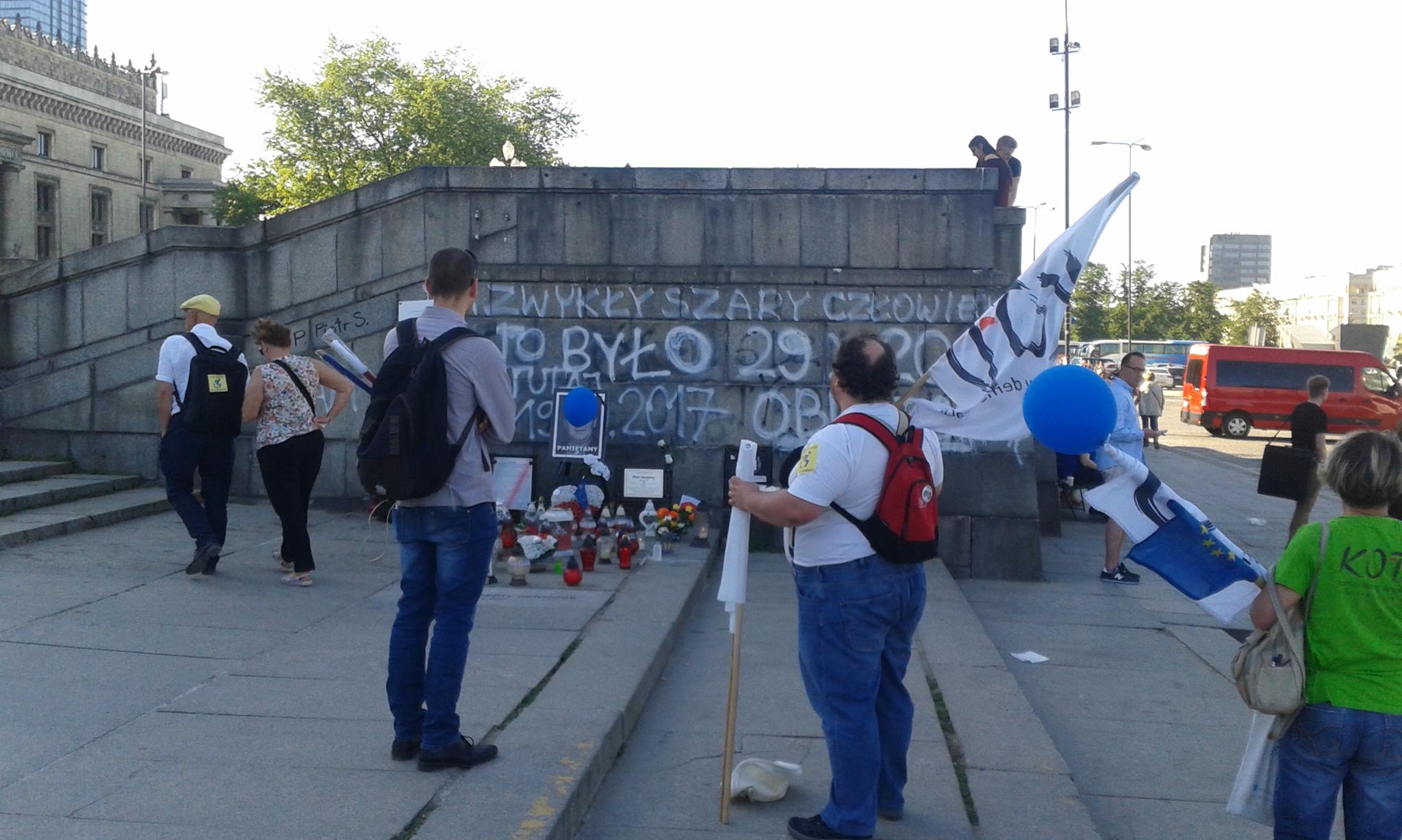 Na koniec dnia odwiedziliśmy miejsce pamięci przed PKiN, gdzie Piotr Szczęsny jesienią 2017 roku dokonał samospalenia w proteście przeciw polityce Prawa i Sprawiedliwości. Chwilą ciszy uczciliśmy pamięć tragicznie zmarłego „szarego człowieka”.