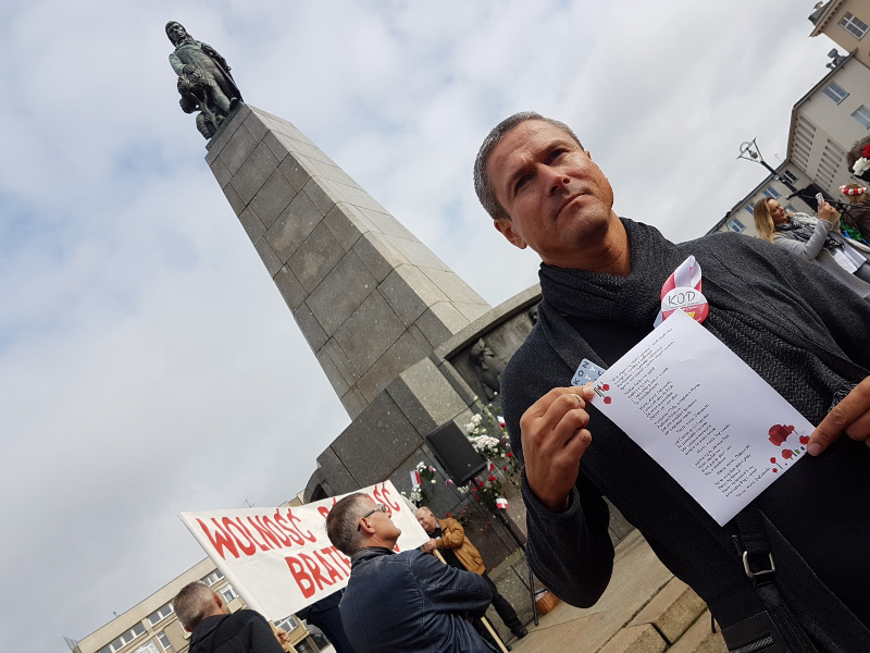 a potem podniósł głowę i zapatrzył się na pomnik. O to skojarzenie nam przecież chodziło, właśnie po to tam stanęliśmy. Właśnie po to będziemy stać w kolejnych tygodniach, wzywając do przestrzegania praw zapisanych w Konstytucji.