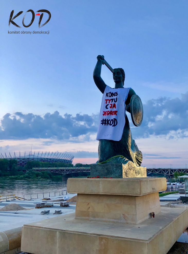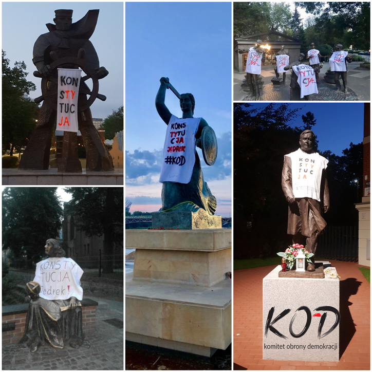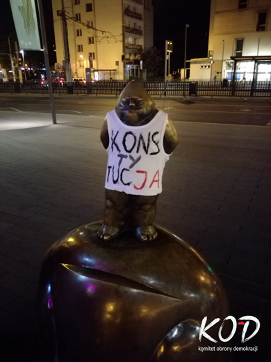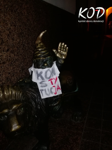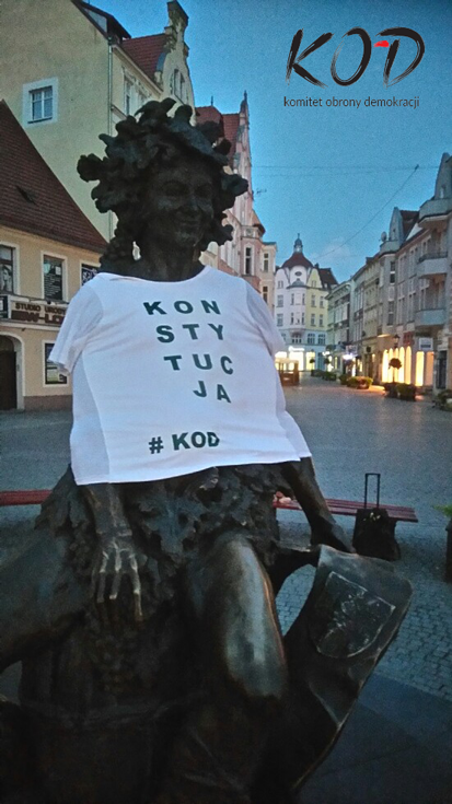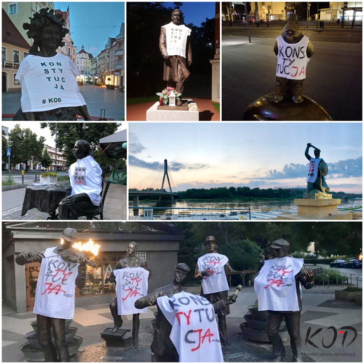 Dlatego w akcie obywatelskiego sprzeciwu oraz solidarności ze ściganymi postanowiliśmy obnażyć prawdziwe intencje PiS-u i minionej nocy w wielu miastach Polski zawiesiliśmy na innych pomnikach i rzeźbach koszulki z napisem KONSTYTUCJA. Chcemy w ten sposób się przekonać, czy według PiS-owskiego aparatu władzy i przemocy słowo KONSTYTUCJA znieważa również Warszawską Syrenkę, Smoka Wawelskiego, szczecińskiego marynarza, wrocławskie krasnale, a także Agnieszkę Osiecką, Mikołaja Kopernika czy Fryderyka Chopina.