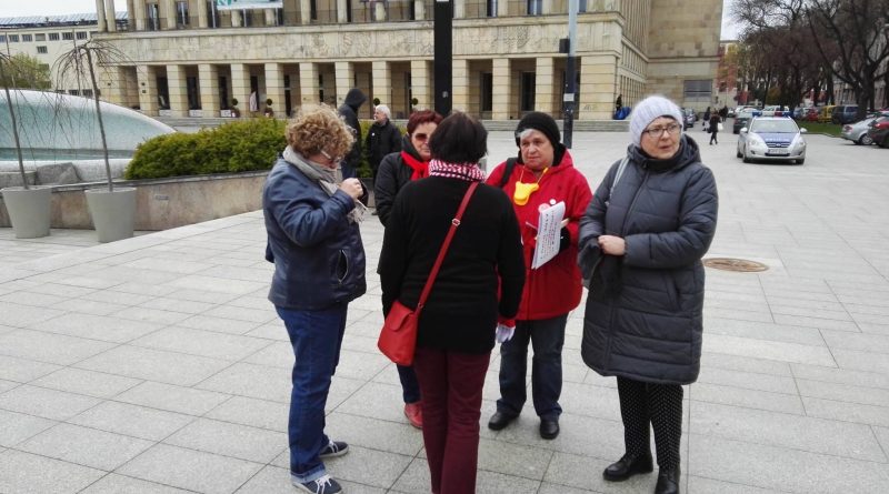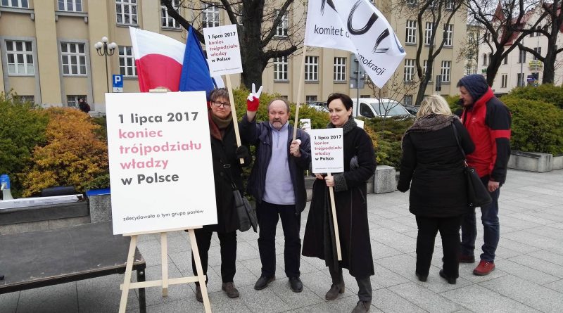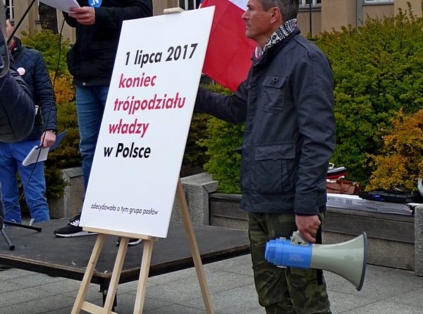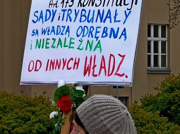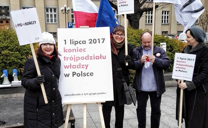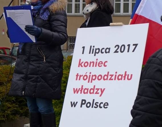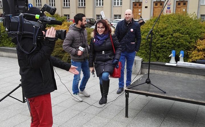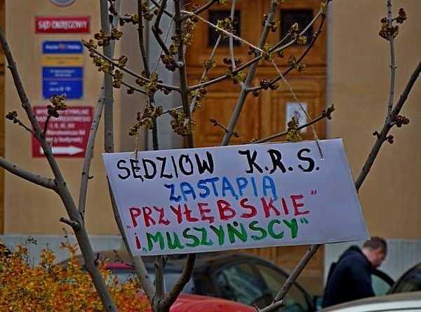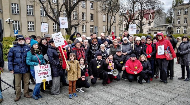 Spotkaliśmy się dziś, w samo południe wyjątkowo zimnego kwietniowego dnia,  przed budynkiem Sądu Okręgowego  na Placu Dąbrowskiego. Wielu z nas nie mogło przyjść – zatrzymała ich praca lub inne obowiązki. Słyszeliśmy też wielokrotnie pytanie, dlaczego w czwartek o 12:00…? Odpowiedź jest prosta – wspieraliśmy protest sędziów. Sędziowie nie mają co prawda prawa do strajku. Jednak w geście symbolicznego sprzeciwu wobec zamachowi na fundamentalną zasadę trójpodziału władzy i niezależności sądów – w całej Polsce o 12:00 przerwali dziś pracę i zorganizowali specjalne zebrania.