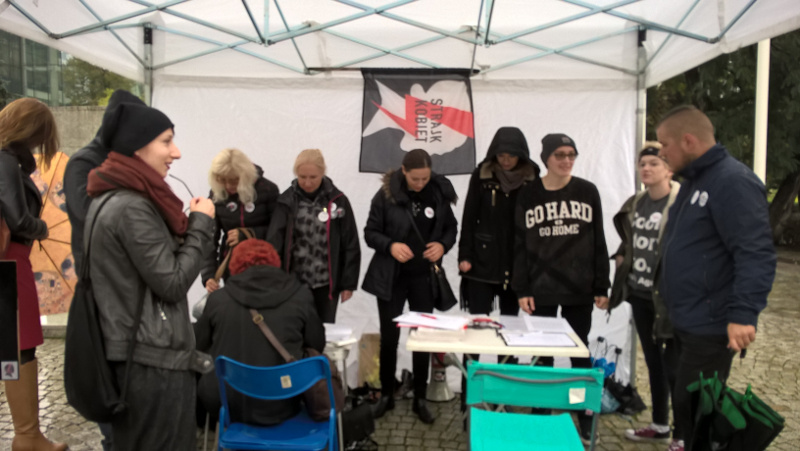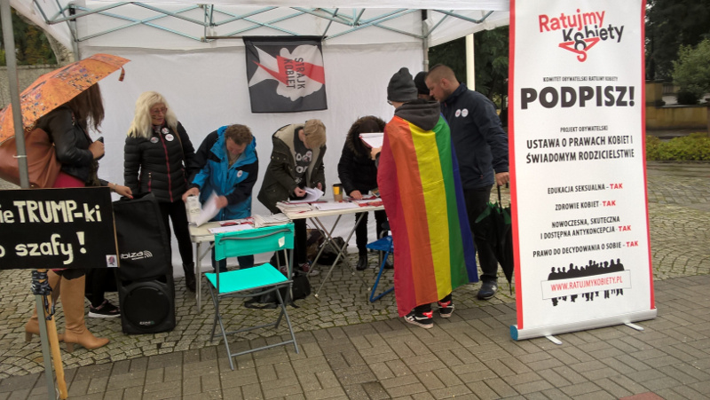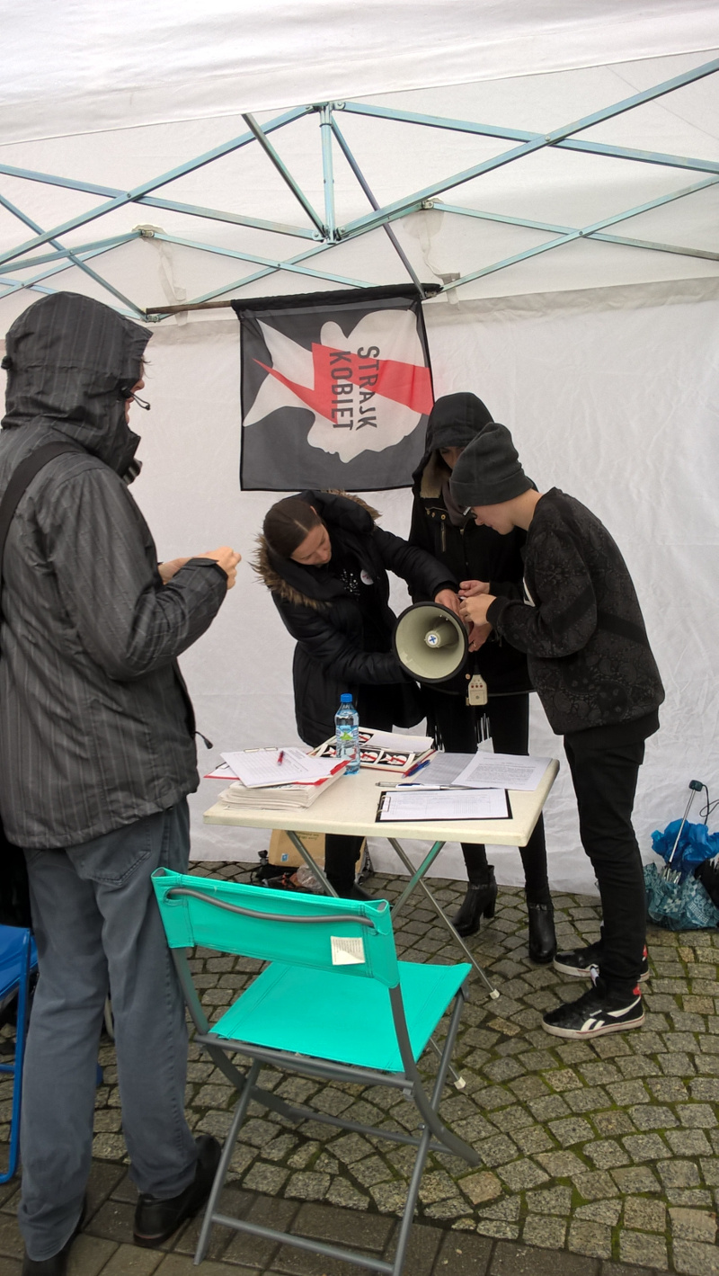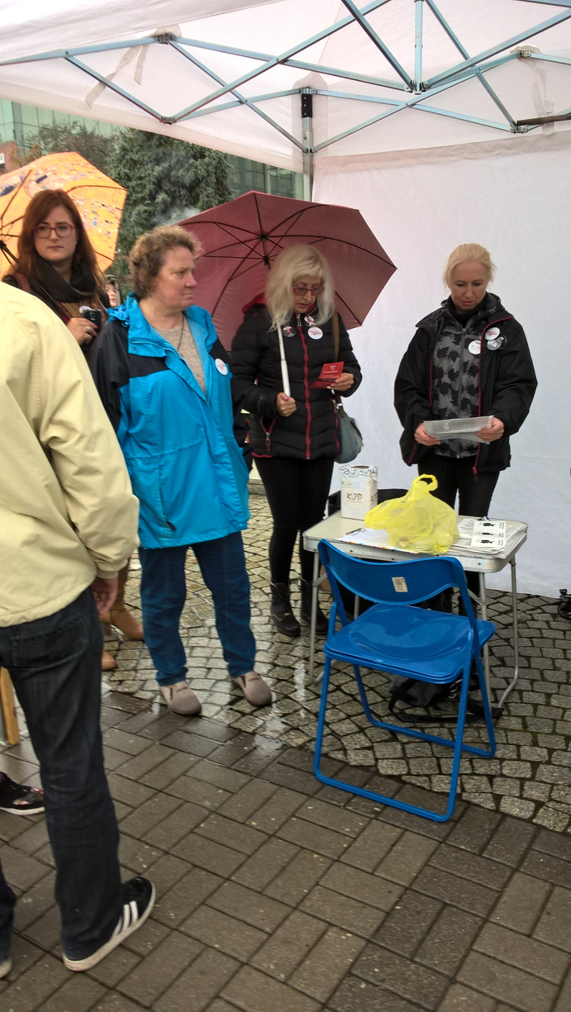 Od początku atmosfera była wspaniała, a pomimo kiepskiej pogody zainteresowanie namiotem rosło. Powoli wokół rósł tłumek Opolan. Mnóstwo osób podchodziło, aby wyrazić swoje poparcie i złożyć podpisy pod nowym projektem ustawy Ratujmy Kobiety. Podchodziły osoby starsze, w średnim wieku, było również wiele młodych kobiet i dziewczyn, pięknych, świadomych swojej wartości, mądrych i zdeterminowanych. Często kobiety były wspierane przez swoich mężów, partnerów, chłopaków…. Na twarzach niektórych dziewczyn pojawiły się czarne wyrysowane grubą kredką krechy – symbol ich determinacji i gniewu. Pojawiły się gwizdki, głośna muzyka wyrażająca bunt kobiet, okrzyki. A wszystko to przy akompaniamencie jednostajnego głosu kilku smutnych panów z ruchu prolife, którzy ustawili swoje drastyczne bilbordy – tzw. kontrdemonstrację – po drugiej stronie placu. Nie byli jednak w stanie ze swoim przekazem przebić się przez tłum sympatyków Czarnego Protestu, szczególnie gdy rozpoczęły się płomienne przemówienia młodych przedstawicielek i przedstawicieli środowisk feministycznych i prodemokratycznych, przerywane spontanicznymi okrzykami i niezwykle entuzjastycznie przyjmowane przez uczestników. Z dumą patrzyłam na młodych – świadomych o co walczą, pragnących wolności, miłości i normalnego życia, pragnących wychowywać swoje dzieci bez traumy i opresji. Ich nieskrywane i prawdziwe emocje przyjęte były przez nas z dużym wzruszeniem.