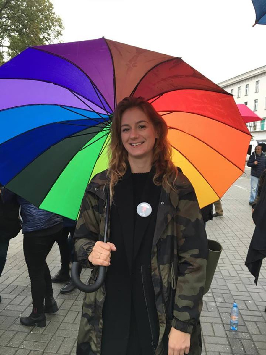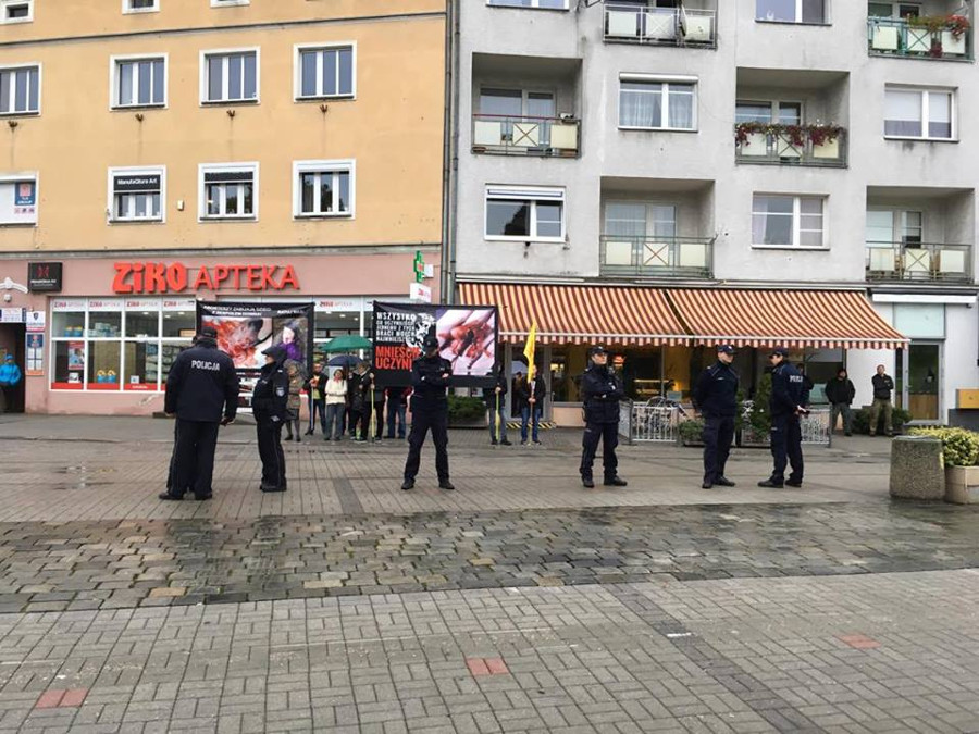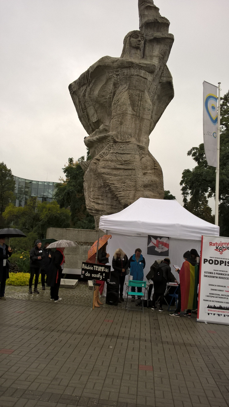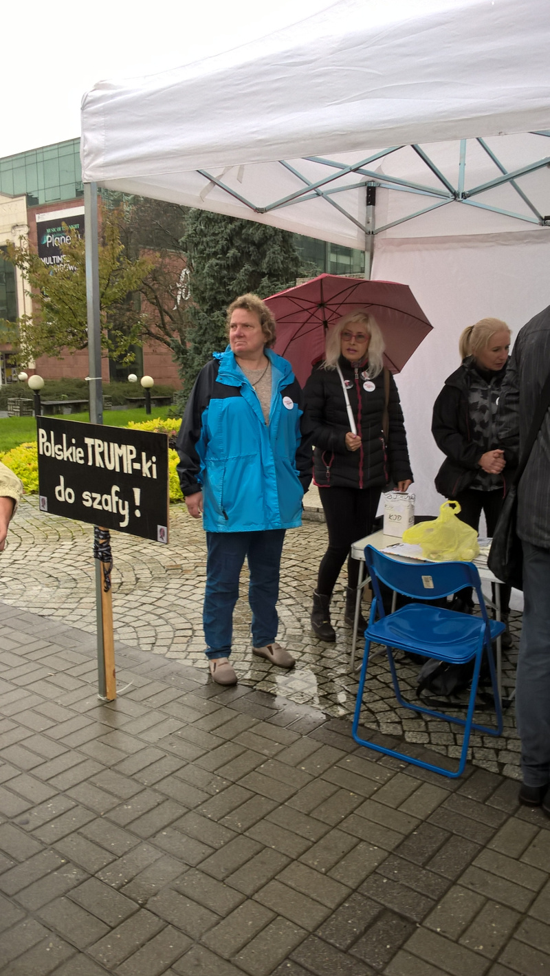 Od początku atmosfera była wspaniała, a pomimo kiepskiej pogody zainteresowanie namiotem rosło. Powoli wokół rósł tłumek Opolan. Mnóstwo osób podchodziło, aby wyrazić swoje poparcie i złożyć podpisy pod nowym projektem ustawy Ratujmy Kobiety. Podchodziły osoby starsze, w średnim wieku, było również wiele młodych kobiet i dziewczyn, pięknych, świadomych swojej wartości, mądrych i zdeterminowanych. Często kobiety były wspierane przez swoich mężów, partnerów, chłopaków…. Na twarzach niektórych dziewczyn pojawiły się czarne wyrysowane grubą kredką krechy – symbol ich determinacji i gniewu. Pojawiły się gwizdki, głośna muzyka wyrażająca bunt kobiet, okrzyki. A wszystko to przy akompaniamencie jednostajnego głosu kilku smutnych panów z ruchu prolife, którzy ustawili swoje drastyczne bilbordy – tzw. kontrdemonstrację – po drugiej stronie placu. Nie byli jednak w stanie ze swoim przekazem przebić się przez tłum sympatyków Czarnego Protestu, szczególnie gdy rozpoczęły się płomienne przemówienia młodych przedstawicielek i przedstawicieli środowisk feministycznych i prodemokratycznych, przerywane spontanicznymi okrzykami i niezwykle entuzjastycznie przyjmowane przez uczestników. Z dumą patrzyłam na młodych – świadomych o co walczą, pragnących wolności, miłości i normalnego życia, pragnących wychowywać swoje dzieci bez traumy i opresji. Ich nieskrywane i prawdziwe emocje przyjęte były przez nas z dużym wzruszeniem.