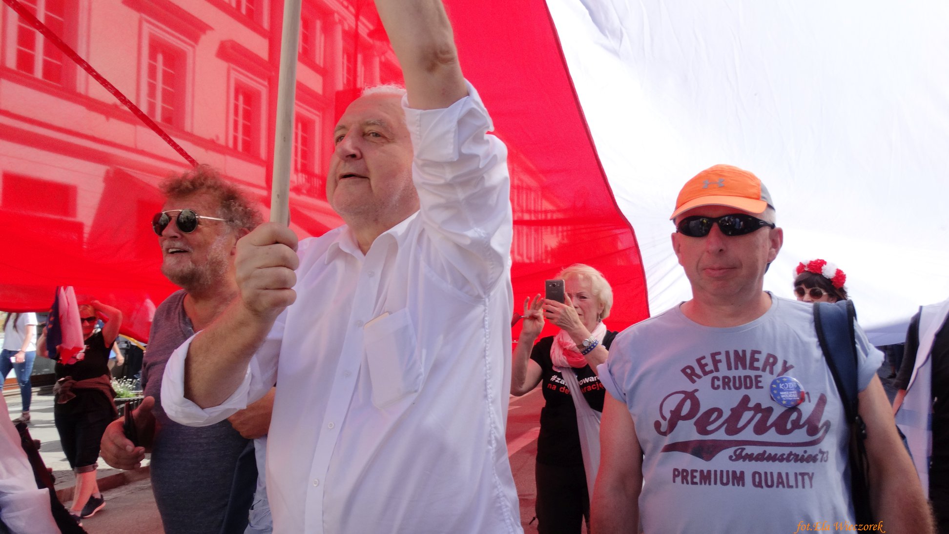 Uczestnicy nieśli również biało-czerwoną sektorówkę przywiezioną przez pomorski KOD przez całą trasę mimo wysokiej temperatury oraz ciężaru kilkadziesiąt osób niosło 60 metrową flagę, w tym również sam prof. Andrzej Rzepliński.