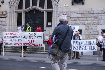 „Łapy precz od Sądu Najwyższego”, „Sąd pod sąd”, „Sąd Najwyższy nie nowogrodzki”, „Kłamcy ! Na PiS głosowało 18, 65% uprawnionych. To nie jest większość”, „Polska Ludowa przy PiS się chowa”.