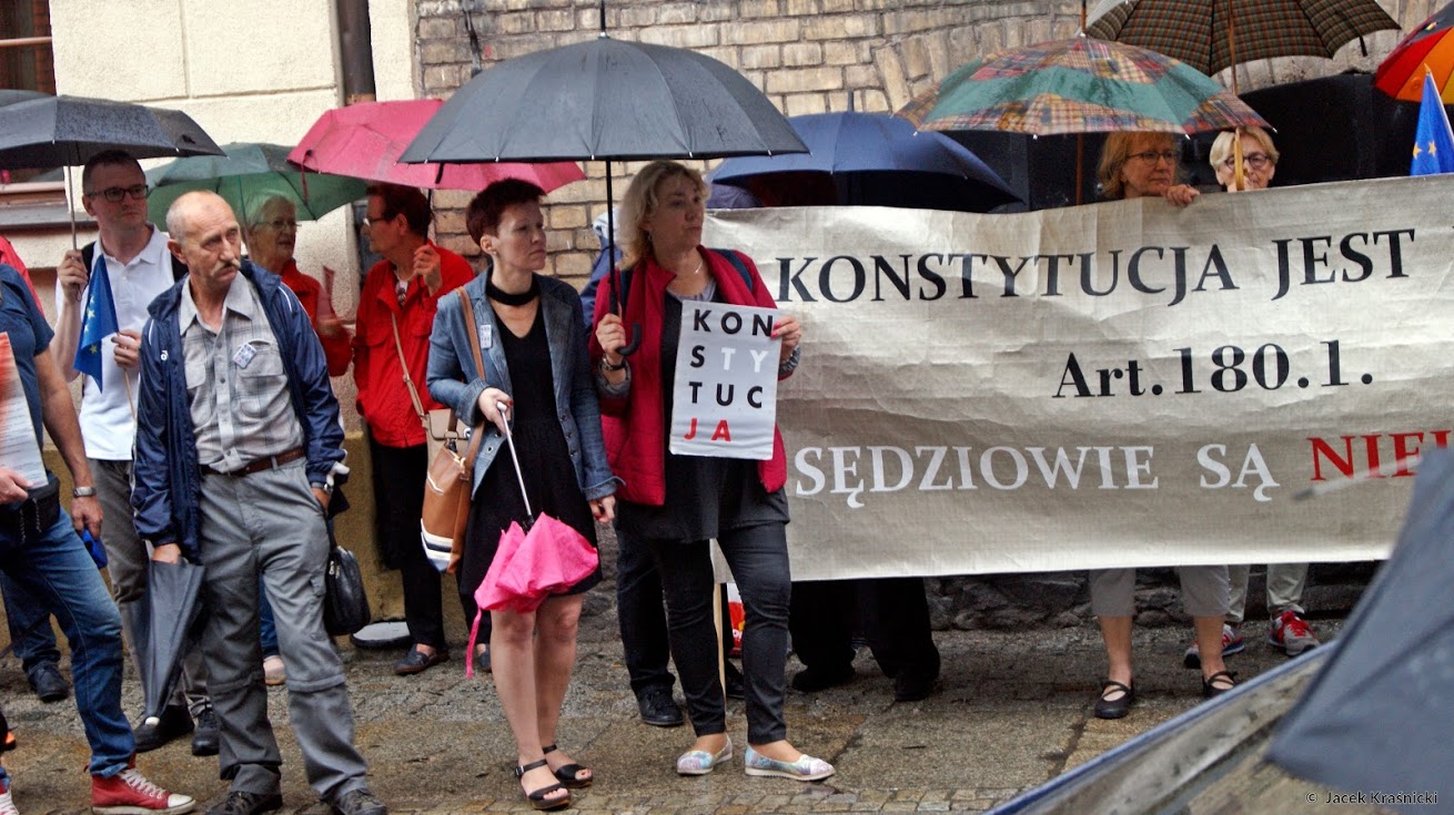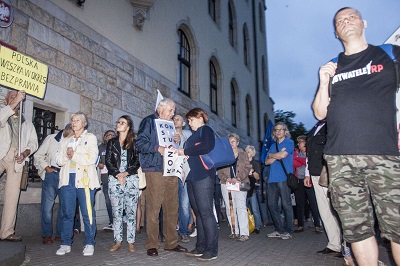 Takie m.in. transparenty pojawiły się pod bydgoskim Sądem Okręgowym 18 lipca, w przeddzień rozpatrywania w Sejmie projektu nowelizacji ustawy:„Prawo o prokuraturze i niektórych innych ustaw”. Czy gniewny ton tych transparentów był uzasadniony? Oczywiście. Kończy się właśnie prowadzony przez PiS proces łamania Konstytucji. Projekt – pisany pospiesznie, niechlujnie, na kolanie – zakłada przecież degradację polskiego sądownictwa, a jego celem jest m.in. przyspieszenie wymiany kadr w Sądzie Najwyższym. Stało nas pod budynkiem kilkudziesięcioro. Może setka? Byliśmy wściekli na to co bezkarnie wyrabia partia z większością w sejmie, ale – jak przypomniała jedna z osób przemawiających – bez względu na to, ilu nas jest, nasz głos jest ważny. Prócz KOD-erów byli pod sądem przedstawiciele Obywateli RP, Bydgoskiego Forum Obywatelskiego, partii politycznych, innych organizacji protestu, wyższych uczelni, służby zdrowia. Wystąpienia były krótkie, ale wszyscy skupiali się na sprawie niezawisłości sądów.