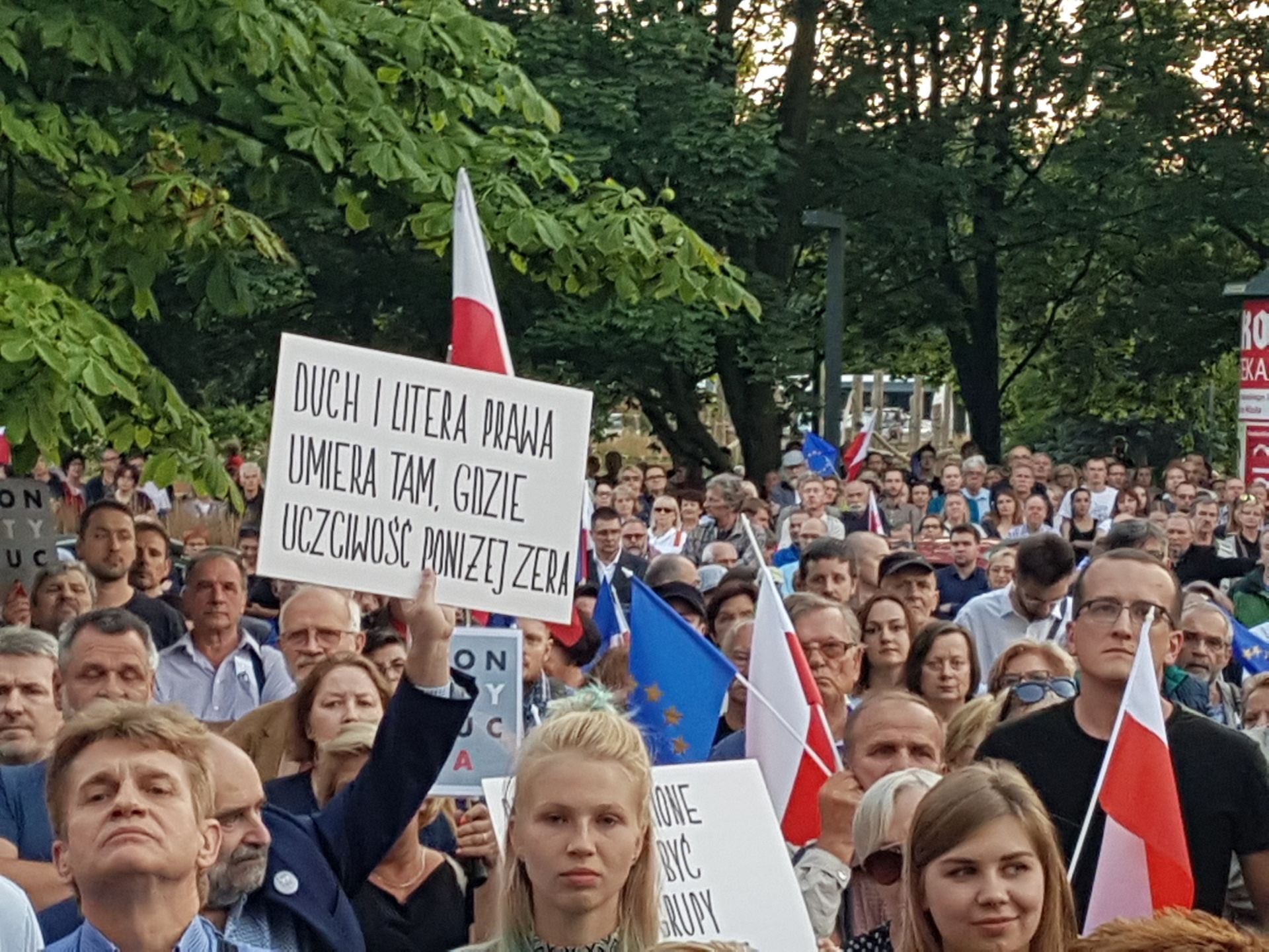 Historia lubi się powtarzać, bowiem dokładnie rok temu, w lipcu, staliśmy pod tymi samymi sądami. Dzisiaj stoimy stoimy tutaj znowu, zmuszeni do walki o ostatni bastion wolności, jakim jest Sąd Najwyższy.