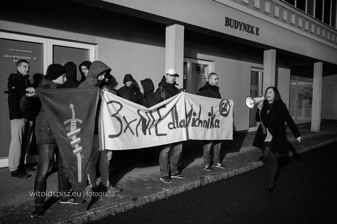 – Zebraliśmy się tutaj aby zaprotestować przeciwko rzeczom, które wypisuje w Gazecie Wyborczej Adam Michnik. Sprzeciwiamy się zapraszaniu Adama Michnika do Leszna. Uważamy, że promowanie liberalnych i lewackich ideologii jest wbrew naszemu narodowemu interesowi. Jako polscy patrioci mówimy temu stanowcze nie – krzyczał przez megafon Michał Świętek, działacz leszczyńskiego koła Młodzieży Wszechpolskiej, licealista. Nie zabrakło też haseł: „Kłamstwa Michnika wrzuć do śmietnika”, „Nie czerwona, nie laicka, tylko Polska katolicka” czy „Ave, ave Christus Rex”. Towarzystwo rozeszło się o godzinie 18:15.
