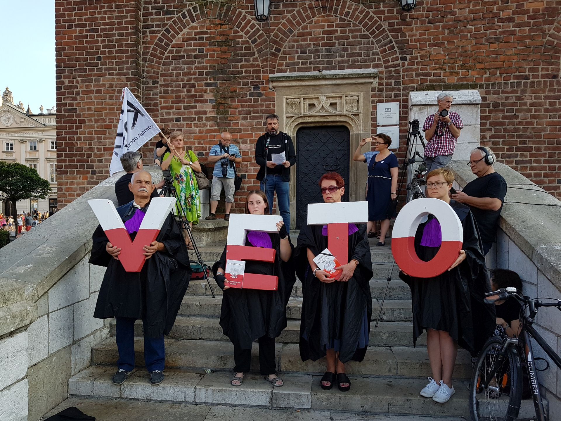 Na schodach prowadzących do Wieży Ratuszowej stanęły cztery osoby w strojach imitujących sędziowskie togi, trzymając w rękach biało-czerwone litery, które tworzyły napis VETO. Wśród demonstrantów wyróżniali się krakowscy sędziowie w czarnych koszulkach z napisem KONSTYTUCJA. Prof. Fryderyk Zoll miał na sobie czarny T-shirt z napisem „Jeżeli chodzi o prawo, to ja mogę doczytać”.